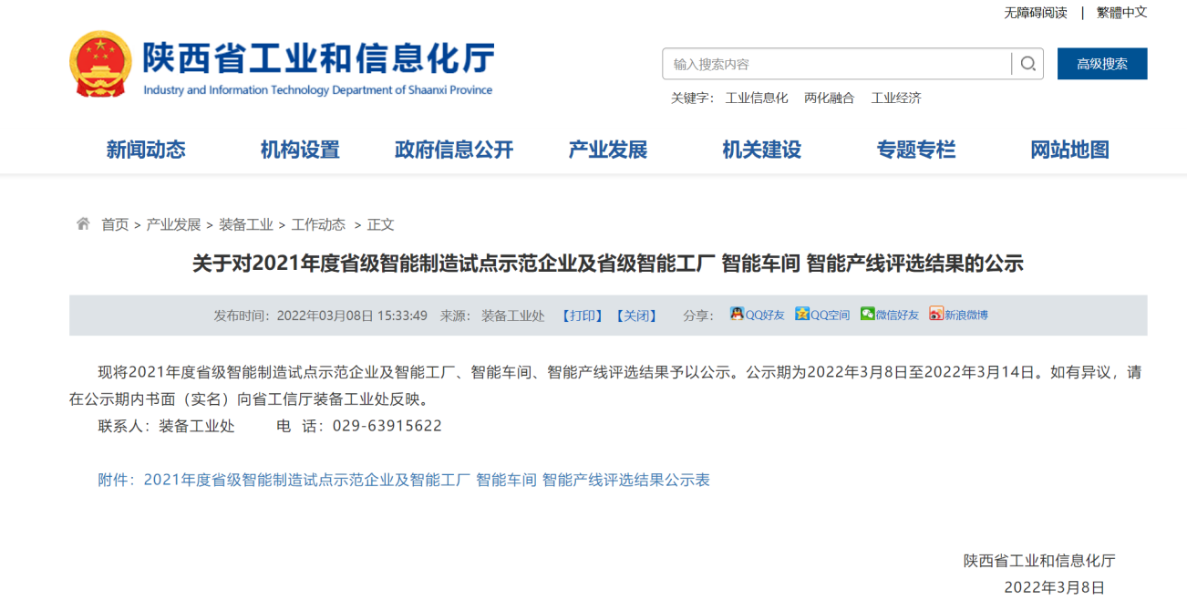 3月14日,陕西省工信厅装备工业发布2021年度省级智能制造试点示范企业及省级智能工厂名单,不朽情缘股份获评“2021年度省级智能工厂”。